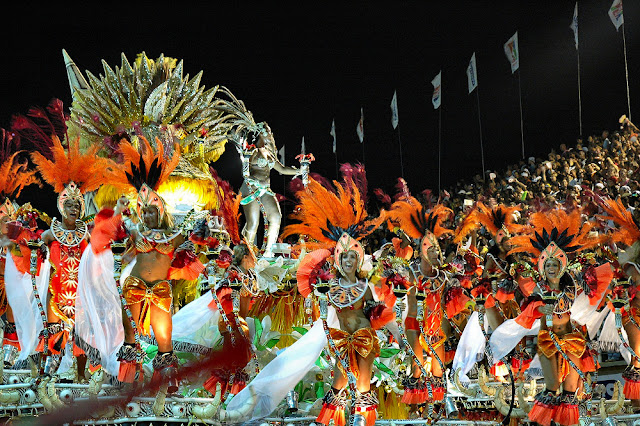 Na sequência, o primeiro casal de mestre-sala e porta-bandeira, Dalow e Débora, fazia sua evolução. A roupa da dupla era em tons de vermelho, branco e dourado com muitas plumas e adereços que formavam padrões geométricos que remetiam a estampas e máscaras africanas. E aqui vai uma curiosidade: o leão não foi o símbolo oficial da agremiação desde seu início. O pavilhão vermelho e branco trazia o brasão do município de Vila Velha ladeado por um surdo e um pandeiro. A mudança só ocorreu após o carnaval de 2010, quando a identidade visual da entidade foi reformulada e o leão foi adotado como símbolo em referência ao time de várzea que deu origem à escola de samba.